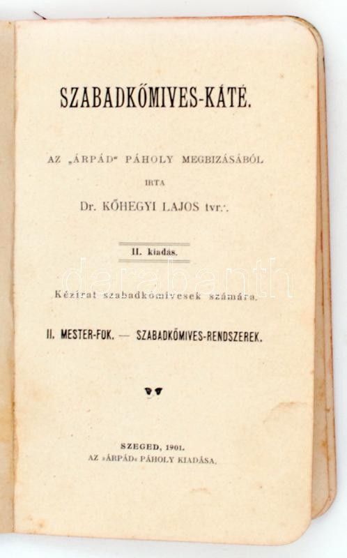 Kőhegyi Lajos dr.: Szabadkőmives-Káté. Az "Árpád" Páholy megbízásából írta - - II. Mester-fok.-Szabadkőmives rendszerek. Szeged, 1901, Az "Árpád" Páholy kiadása. Kiadói egészvászon kötésben, foltos fedőborítóval. (Az utolsó oldalból hiányzik egy szöveget nem érintő darab.)