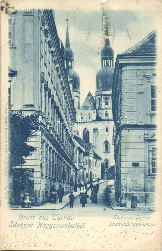 Nagyszombat, Szeminárium utca, kiadja Horovitz Adolf / street (b) https://www.darabanth.com/hu/231-Gyorsarveres/231.0/Kepeslapok/Felvidek~7/Nagyszombat-Szeminarium-utca-kiadja-Horovitz-Adolf-street-b~II1041770