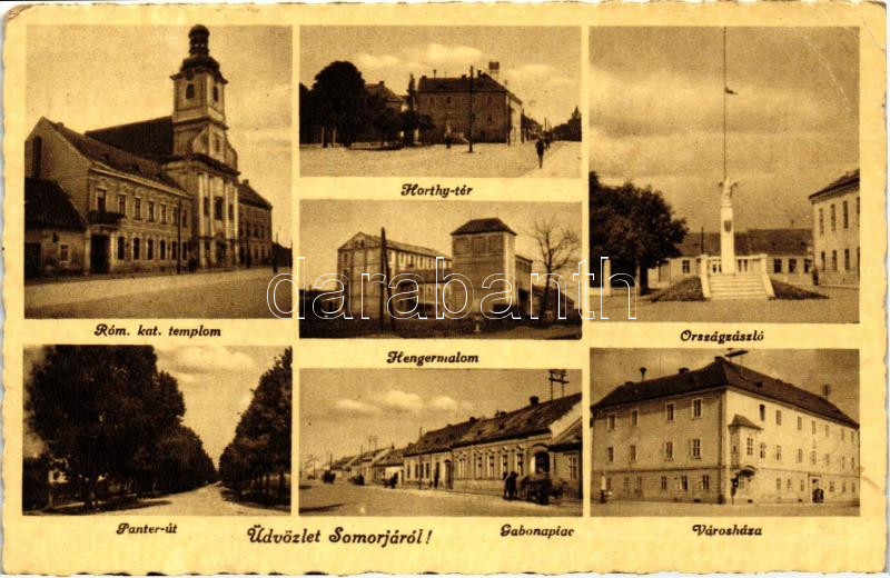 Somorja, Római katolikus templom, Horthy tér, Hengermalom, országzászló, Panter út, Gabonapiac, városháza / Roman catholic church, square, mill, flag, street, market, town hall (EB)