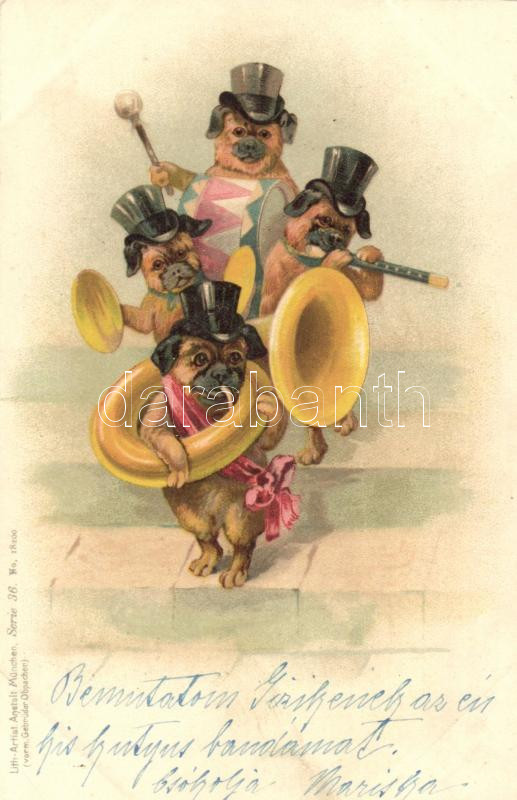 Dog band, Serie 36. No. 18200. litho (EK) https://www.darabanth.com/hu/231-Gyorsarveres/231.0/Kepeslapok/Kutya~600094/Dog-band-Serie-36-No-18200-litho-EK~II1046701