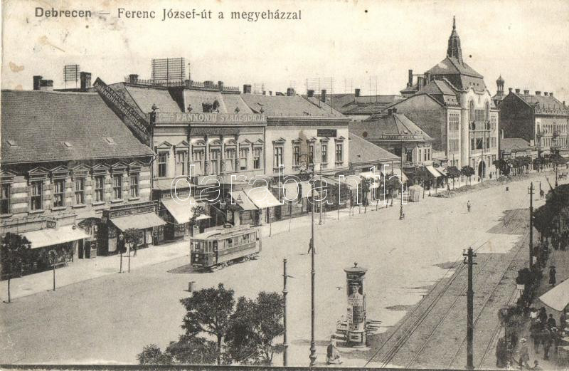 Debrecen, Ferencz József út, megyeház, Márkus Jenő Pannónia szállodája, bazár, Riesz Lipót cukrászdája, Arany Angyal, Lofkovits Arthur üzlete, villamos (EK)