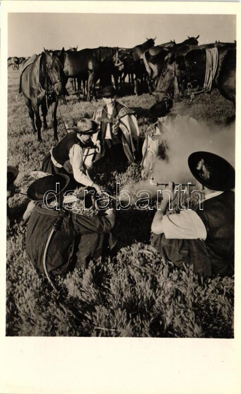 Leírás: Hortobágy, Pásztortűznél, csikósok, folklór