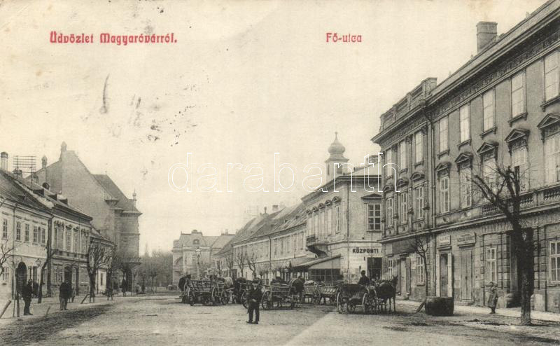Leírás: Mosonmagyaróvár, Magyaróvár; Fő utca, Központi szálloda, Gazdasági egyesület, Takarékpénztár, szekerek (EK)