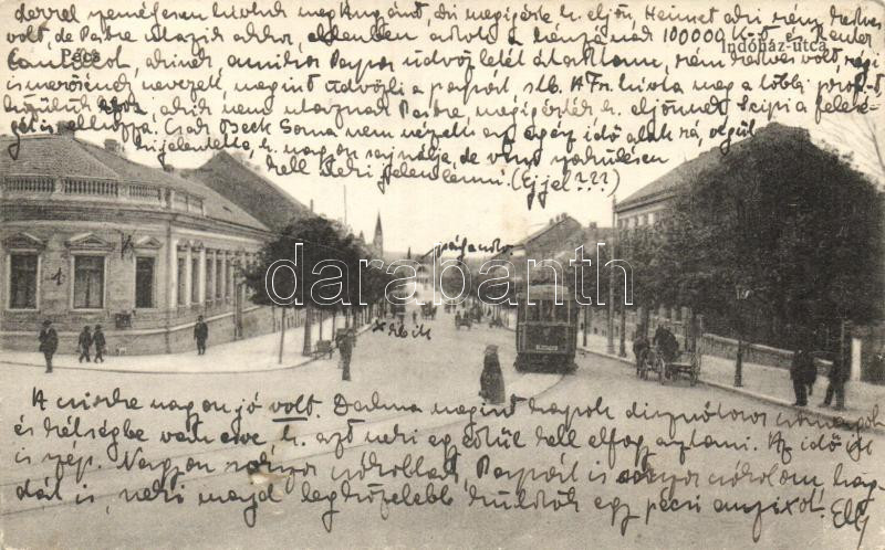Leírás: Pécs, Indóház utca, villamos; Karpf Berta kiadása