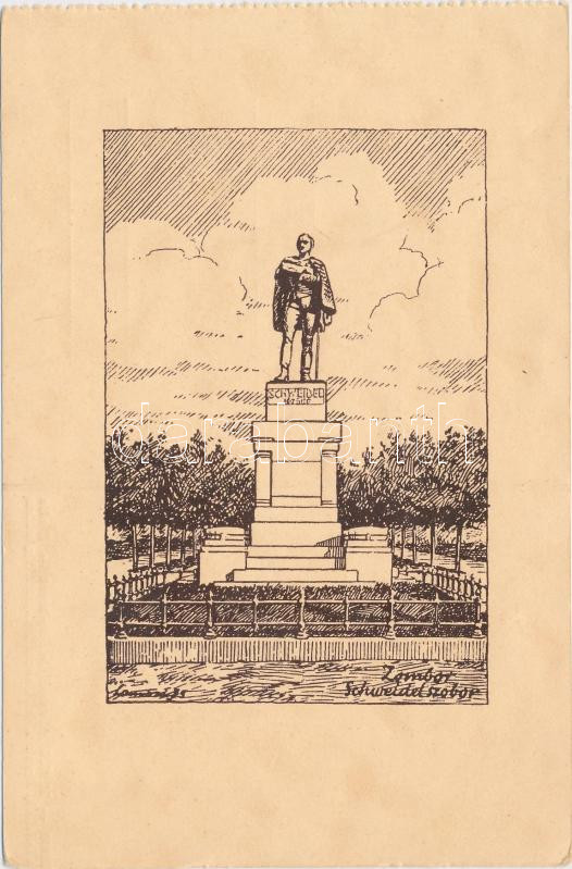 Leírás: Zombor, Schweidel szobor, rézkarc; Délvidéki Egyetemi és Főiskolai Hallgatók Egyesülete / statue, etching s: Lamoss
