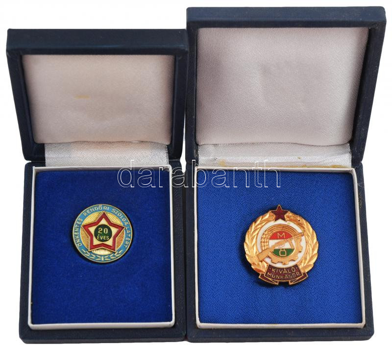 Leírás: ~1970-1980. "20 éves Önkéntes Rendőri Szolgálatért" zománcozott fém jelvény tokban + "Kiváló Munkásőr" zománcozott, aranyozott fém jelvény tokban T:2,2-
