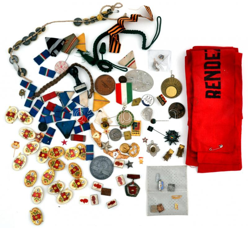 Vegyes magyar és külföldi jelvények, felvarrók, mellszalagok, szalagsávok, gombok, plakettek, replikák, főként a szocialista időszakból, 0,8 kg súlyban T:vegyes