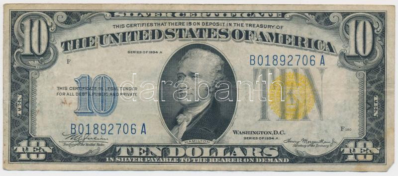 USA 1934A 10 Dollars "Silver... https://www.darabanth.com/hu/231-Gyorsarveres/231.0/Numizmatika/Kulfoldi-bankjegyek~400010/Amerikai-Egyesult-Allamok-1934A-10USD-TIII-3Cbr3EUSA-1934A-10-Dollars-Silver-Certificate--Small-si~II1043823