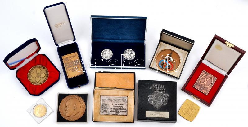10db vegyes modern külföldi emlékérem és plakett többnyire tokban, közte 1959. "A Bécsi Történeti Múzeum megnyitására / Épült Dr. Theodor Körner szövetségi elnök 80. születésnapja alkalmából" Br emlékérem eredeti tokban. Szign.: Welz (71mm) T:vegyes
