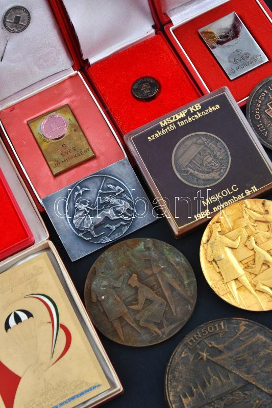 Leírás: 18db vegyes magyar emlékérem, plakett és díjérem, közte 1971. "Vadászati Világkiállítás Budapest 1971" fém plakett (70x52mm) + 1975. "BHN. Augusztus 20. 75" fém emlékplakett tokban (117x75mm) + 1988. "MSZMP KB szakértői tanácskozása Miskolc 1998. november 9-11" feliratú tokban "Civitatis Miskolcz Sigillum" Br emlékérem (43mm) T:vegyes