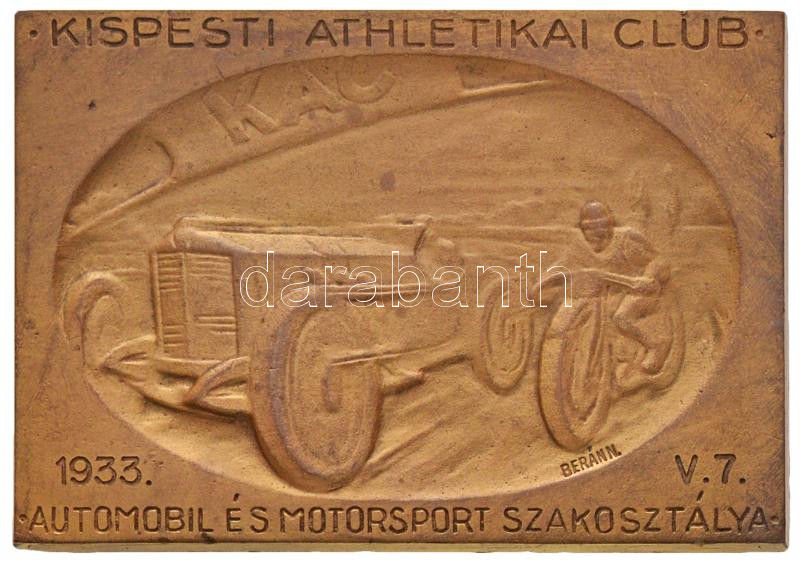 1933. "Kispesti Athletikai Club Automobil és Motorsport Szakosztálya" aranyozott Br plakett "BERÁN N. / BUDAPEST, DÖBRENTEI U. 2." gyártói jelzéssel (55x78mm) T:2