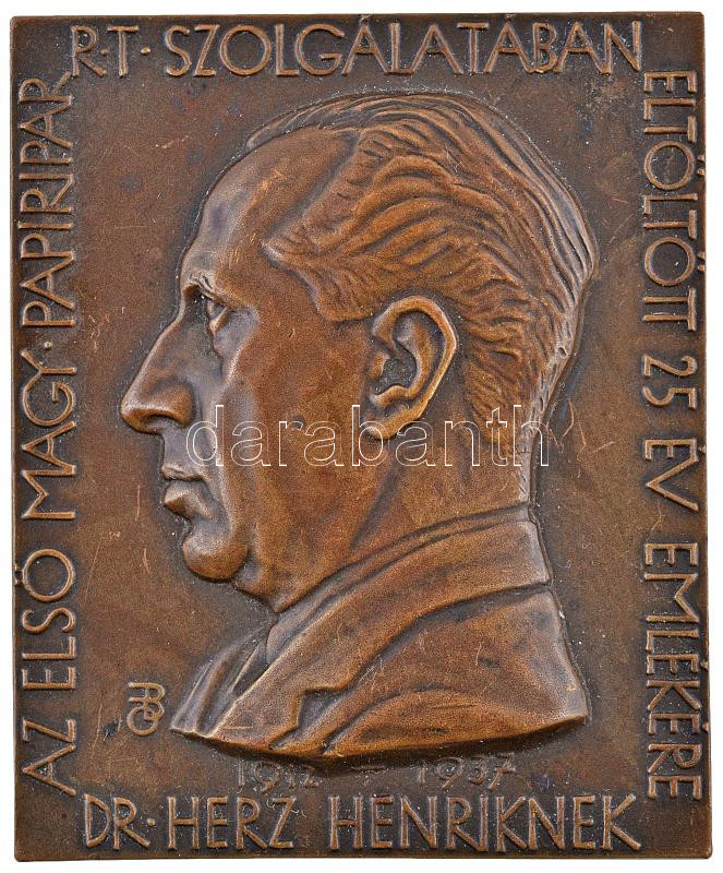 Beck Ötvös Fülöp (1873-1945) 1937. "Az első magyar Papíripar Rt. szolgálatában eltöltött 25 év emlékére Dr. Herz Henriknek 1912-1937" Br emlékplakett (69x57mm) T:2