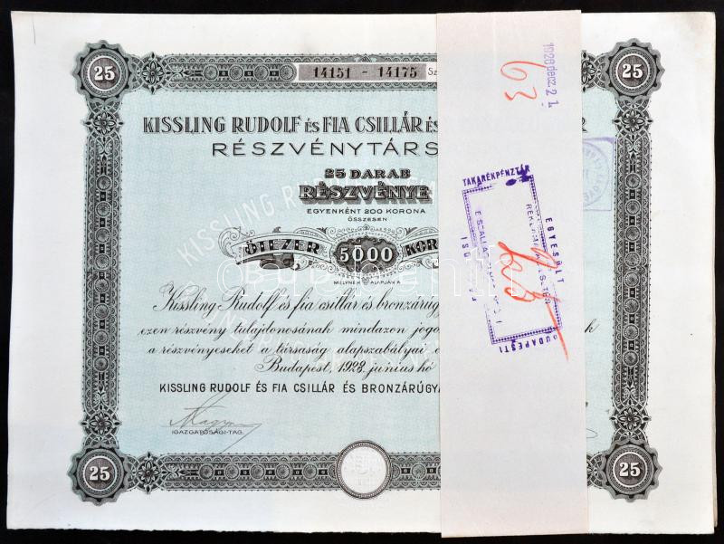 Leírás: Budapest 1923. "Kissling Rudolf és Fia Csillár és Bronzárugyár Részvénytársaság" részvénye 5000K-ról, szelvényekkel, szárazpecséttel T:II