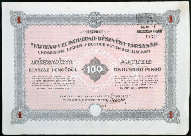 Leírás: Budapest 1941. "Magyar Czukoripar Részvénytársaság" részvénye 100P-ről, szelvényekkel, szárazpecséttel és bélyegzéssel T:II