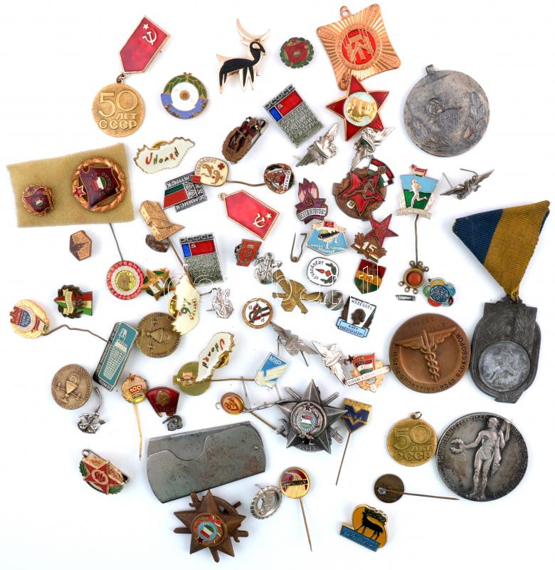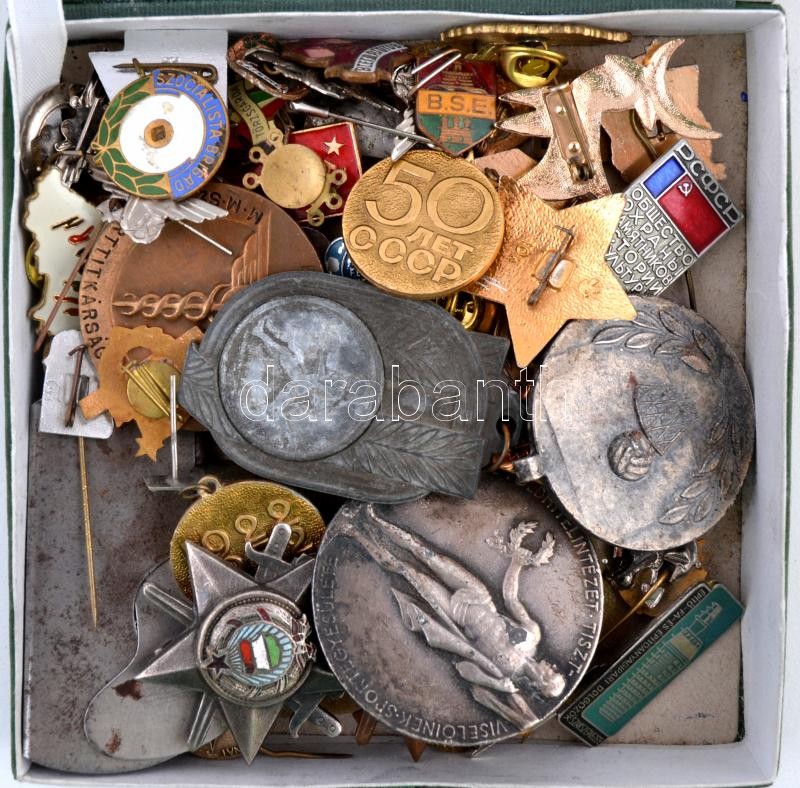 Leírás: Kis doboznyi vegyes jelvény és érem, főleg szocialista darabokkal, közte néhány sportérem is T:vegyes