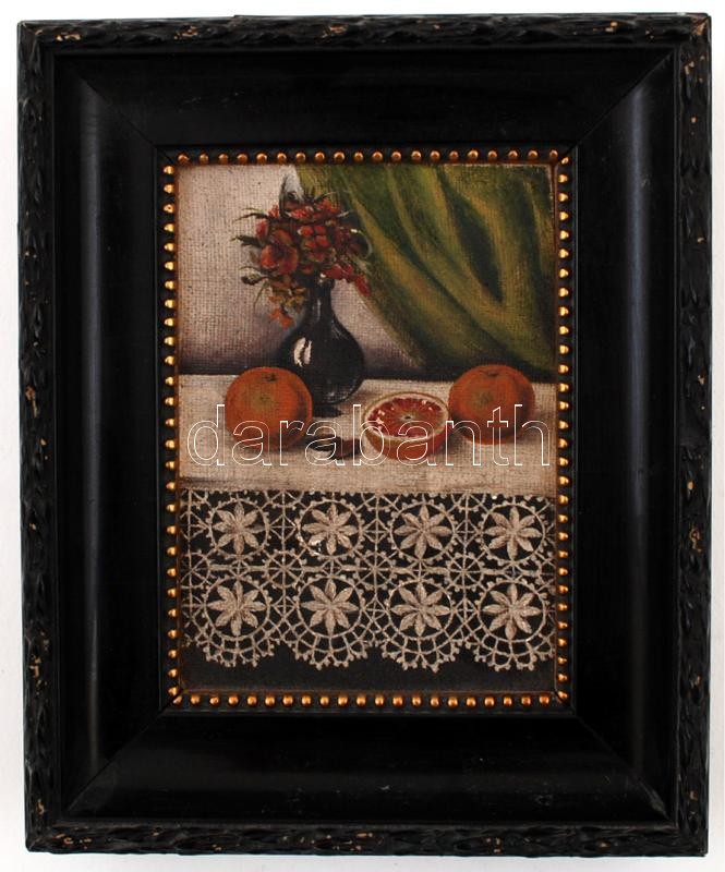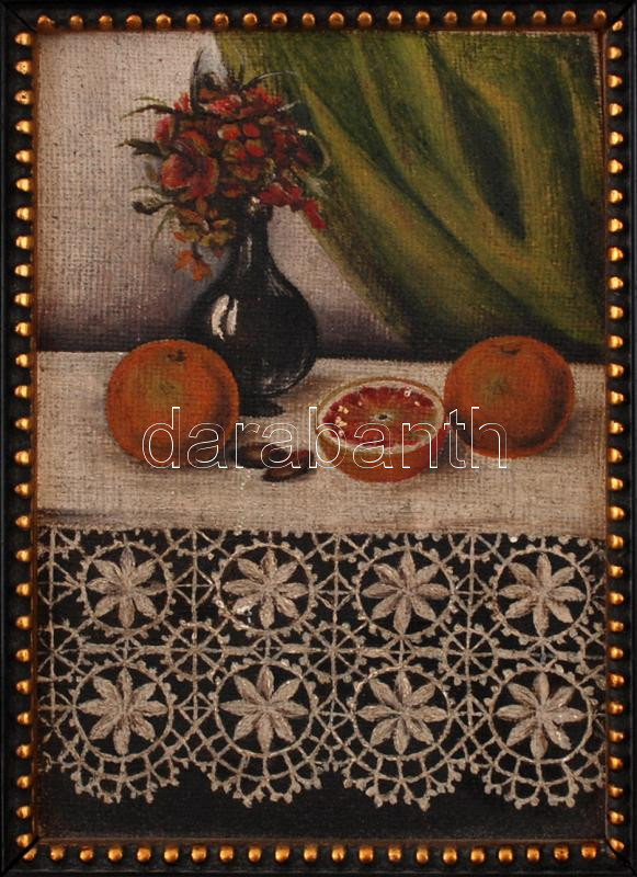 Leírás: Jelzés nélkül: Csendélet asztalterítővel (naiv festmény). Olaj, karton, antik keretben, 12×8 cm
