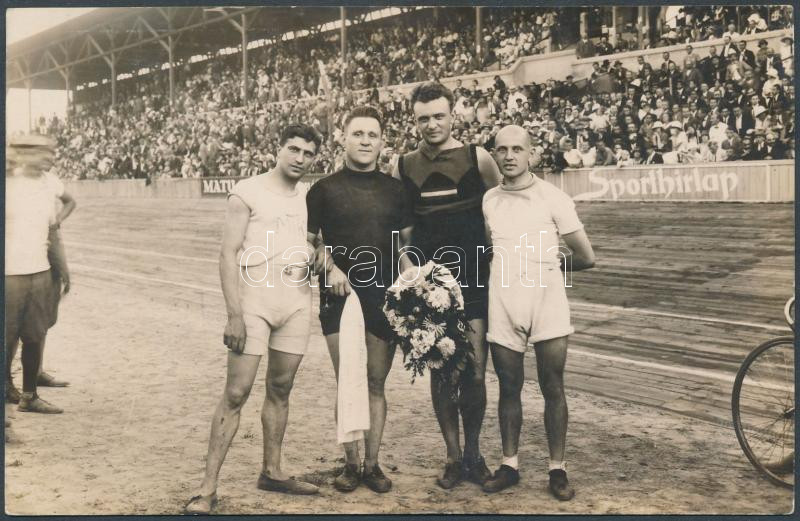 Leírás: cca 1925 Schäffer udvari fényképész felvétele a kerékpárverseny győzteseiről a budapesti Millenáris Velodrom-ban, pecséttel jelzett fotólap, 9x14 cm