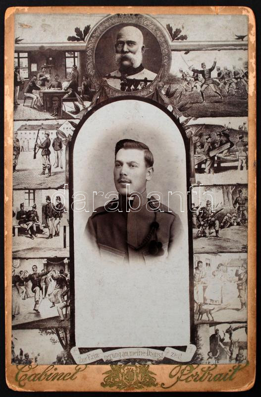 Leírás: cca 1900 Triesztben készült katonafotó, körülötte a katona élet jelenetei, Ferenc József császár képével, keményhátú fotó, 16,5x10,5 cm