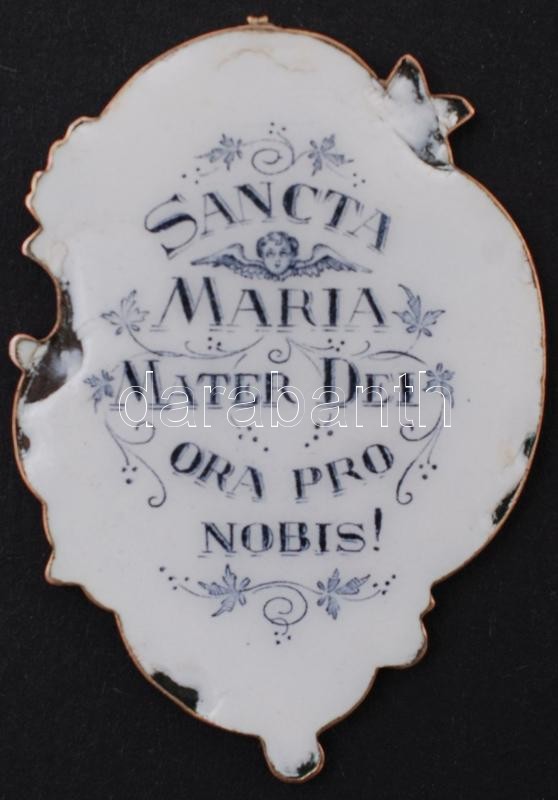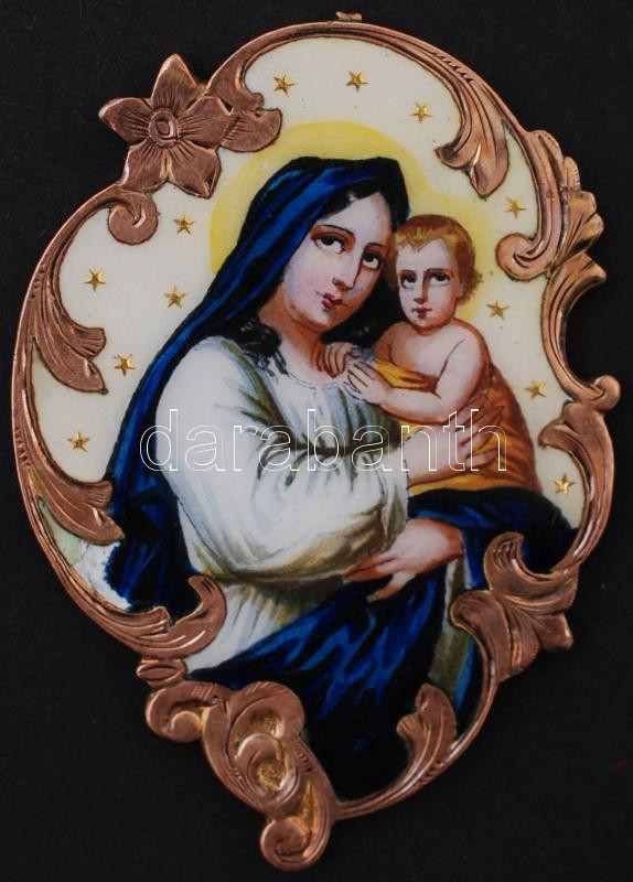 14K (Au) arany foglalatú, kézzel festett porcelán szentképes medál. Porcelán kissé sérült, jelzés nélkül, 3×5 cm, bruttó:10,3 gr. / Vintage porcelain medal with handpainted image, in 14C gold frame 5 cm