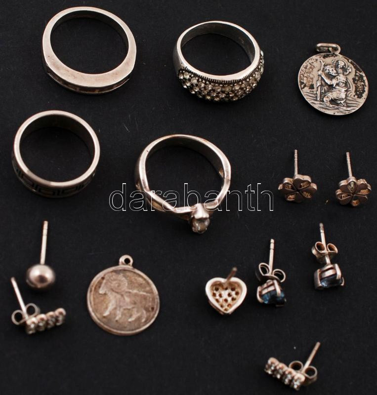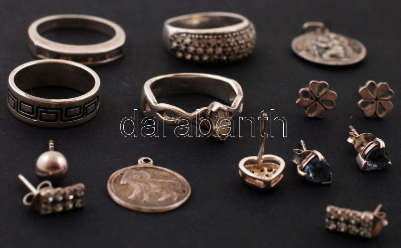 Vegyes ezüst tétel: gyűrűk, fülbevalók, medálok, kő berakásokkal, jelzettek, különböző méretben, összesen br. 21,8 gr /