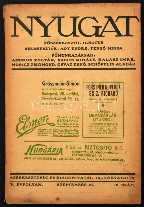1912 A Nyugat című folyóirat V. évfolyamának 18. száma, benne Gróf And... https://www.darabanth.com/hu/232-Gyorsarveres/232.0/Festmeny-mutargy-papirregiseg-egyeb/Nyomtatvanyok~400010/1912-A-Nyugat-cimu-folyoirat-V-evfolyamanak-18-szama-benne-Grof-Andrassy-Gyula-Rado-Sa~II1048601