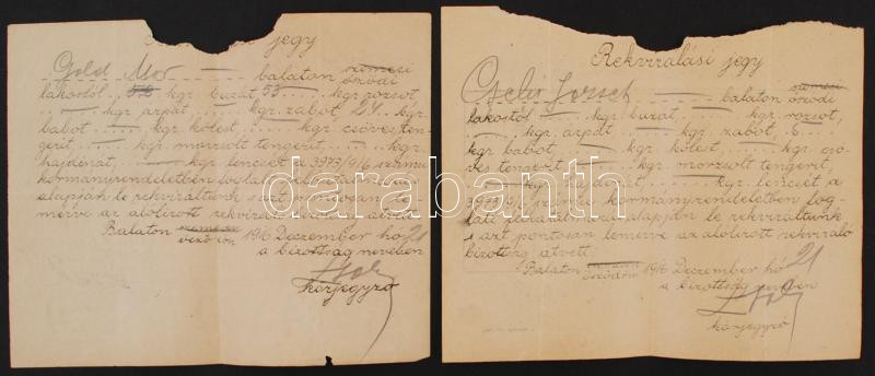Leírás: 1916 Rekvirálási jegy, 2db az egyik izraelita vallású személytől, lapszél hiányos
