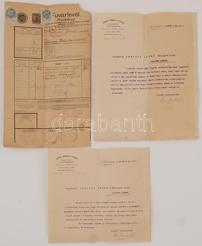 Leírás: 1917 Fuvarlevél(sarka hiányos) 10f-es díjjeggyel és 2 10f illetékkel, 2 db számla Balatanboglár Simon József és fia