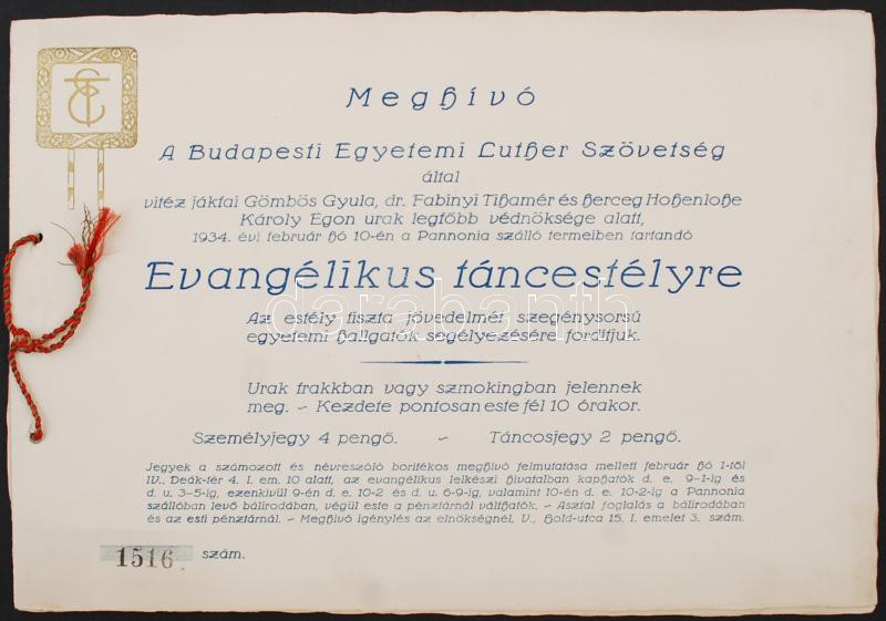 1934 Meghívó a Budapesti Egyetemi Luther Szövetség által rendezett eva... https://www.darabanth.com/hu/232-Gyorsarveres/232.0/Festmeny-mutargy-papirregiseg-egyeb/Nyomtatvanyok~400010/1934-Meghivo-a-Budapesti-Egyetemi-Luther-Szovetseg-altal-rendezett-evangelikus-tancestelyre-~II1045342