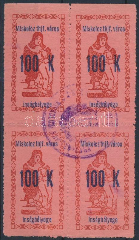 Leírás: Városi okmánybélyegek: Miskolc 100K ínségbélyeg négyestömb (10.000)