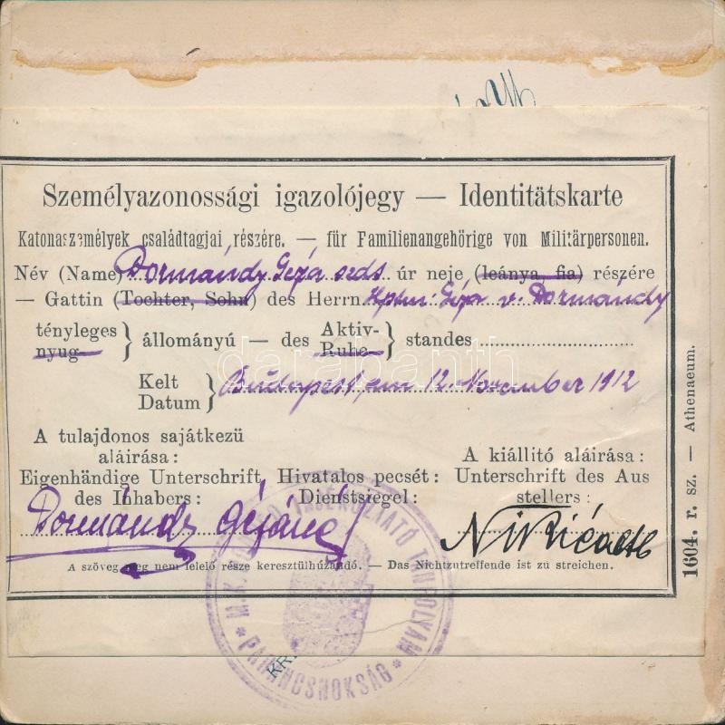 Leírás: 1912 Bp., Fényképes személyazonossági igazolójegy(Identitätskarte)