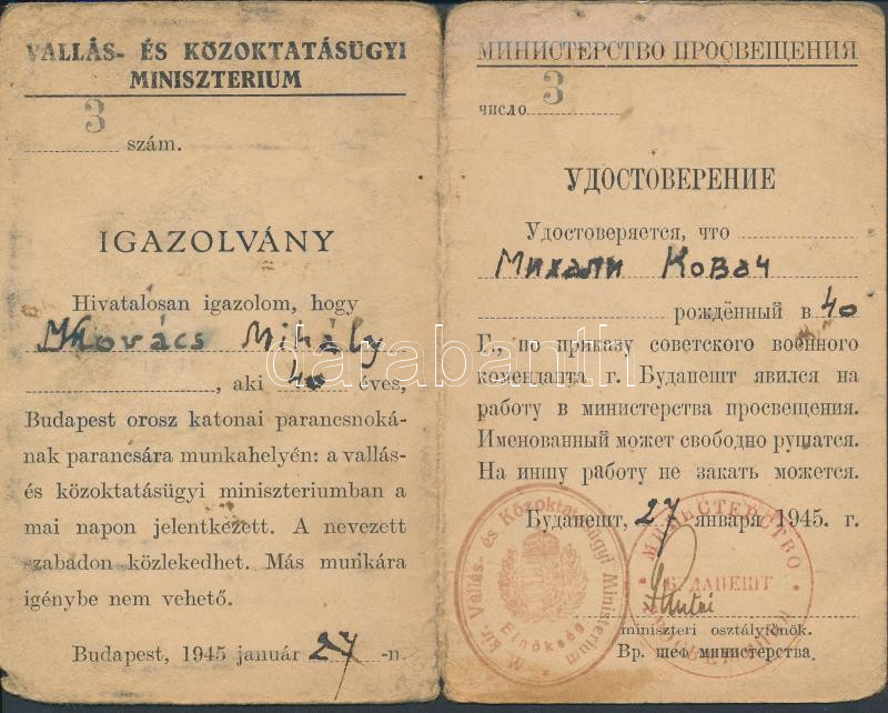 1945 Bp., A Vallás- és Közoktatásügyi Minisztérium által kiállított ké... https://www.darabanth.com/hu/232-Gyorsarveres/232.0/Festmeny-mutargy-papirregiseg-egyeb/Okmanyok~400023/1945-Bp-A-Vallas-es-Kozoktatasugyi-Miniszterium-altal-kiallitott-ketnyelvu-szabad-ko~II1053247
