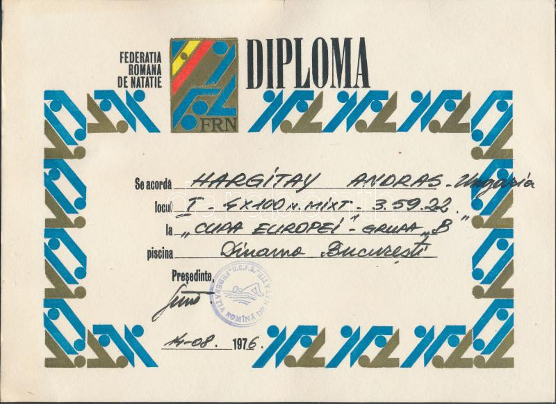 Leírás: 1976 Hargitay András (1956-) úszó számára kiállított oklevél
