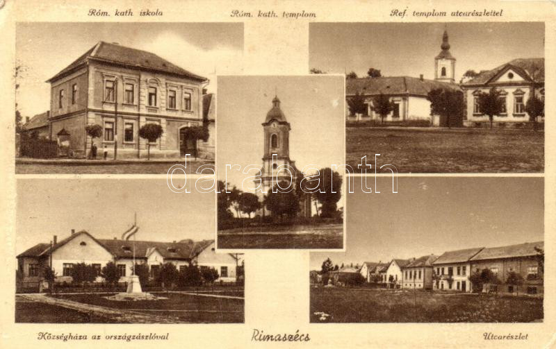 Rimaszécs, Római katolikus iskola és templom, Református templom, Községháza, országzászló, utca, Özv. Kovács Józsefné kiadása / Roman catholic church and school, Calvinist church, town hall, flag, street (EK)