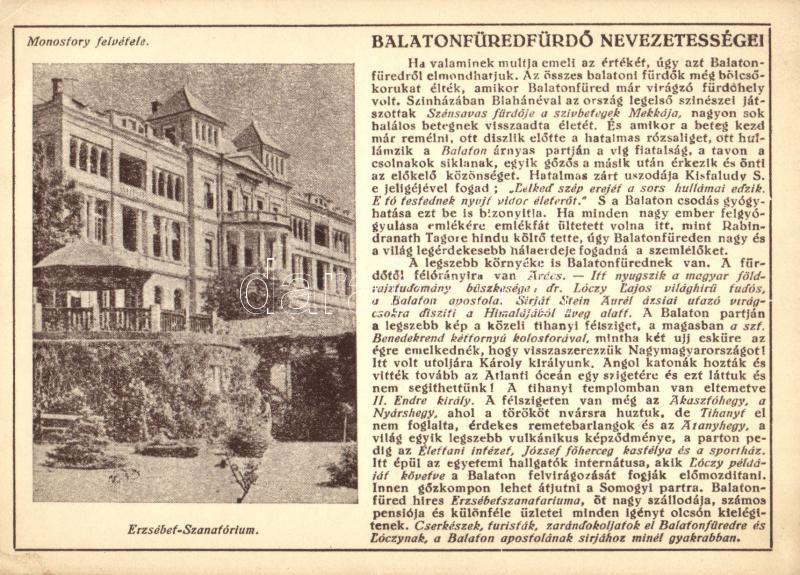 Leírás: Balatonfüredfürdő nevezetességei, Erzsébet szanatórium, kiadja Farkasfalvi Kornél (EK)