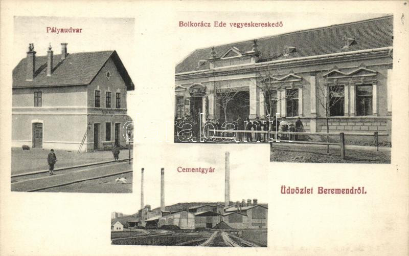 Leírás: Beremend, pályaudvar, vasútállomás, Bolkovácz Ede vegyeskereskedése, Cementgyár; Stegmüller fényirda