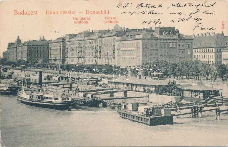 Leírás: Budapest V. Bristol és Hungária szálloda, Duna, gőzhajó; kiadja Taussig A. (EB)