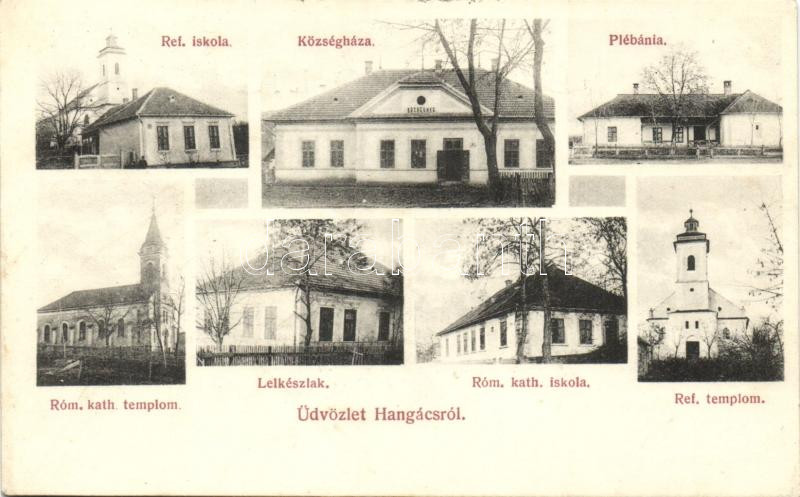 Leírás: Hangács, Római katolikus és Református iskola, Községháza, Plébánia, lelkészlak; kiadja Szilágyi Arthur (EK)