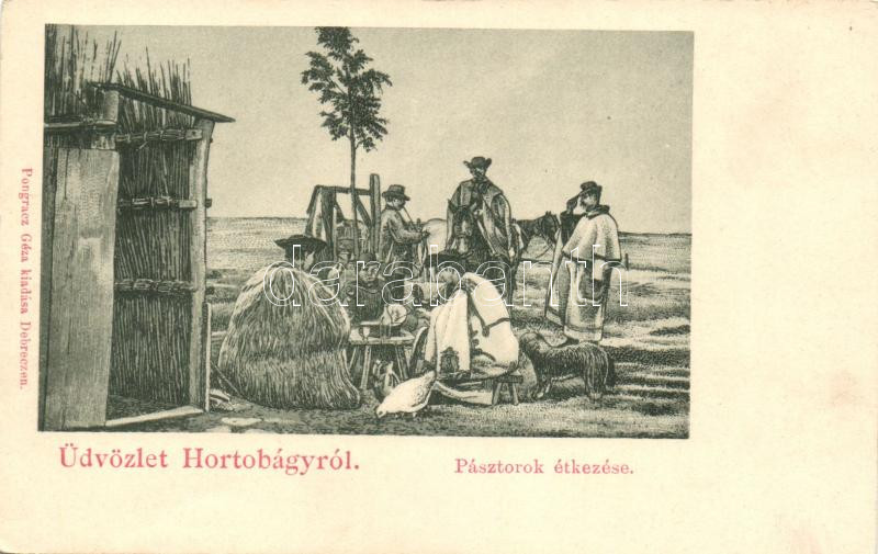 Hortobágy, Pásztorok étkezése, kiadja Pongrácz Géza https://www.darabanth.com/hu/232-Gyorsarveres/232.0/Kepeslapok/Magyarorszag~200005/Hortobagy-Pasztorok-etkezese-kiadja-Pongracz-Geza~II1050018