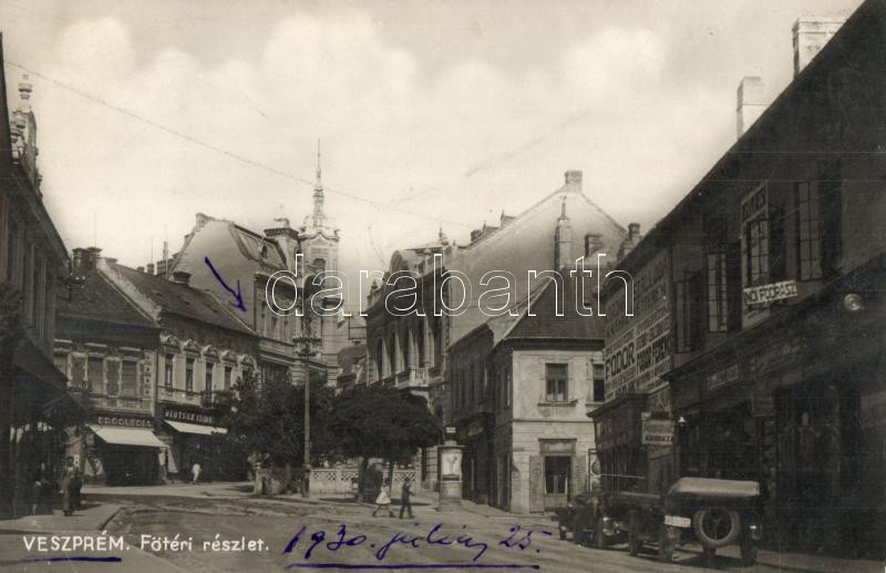 Leírás: Veszprém, Fő tér, Drogéria, gyógyszertár, Deutsch Izidor, Pongrácz és Fodor Ferencz üzlete, Korona szálloda, automobile