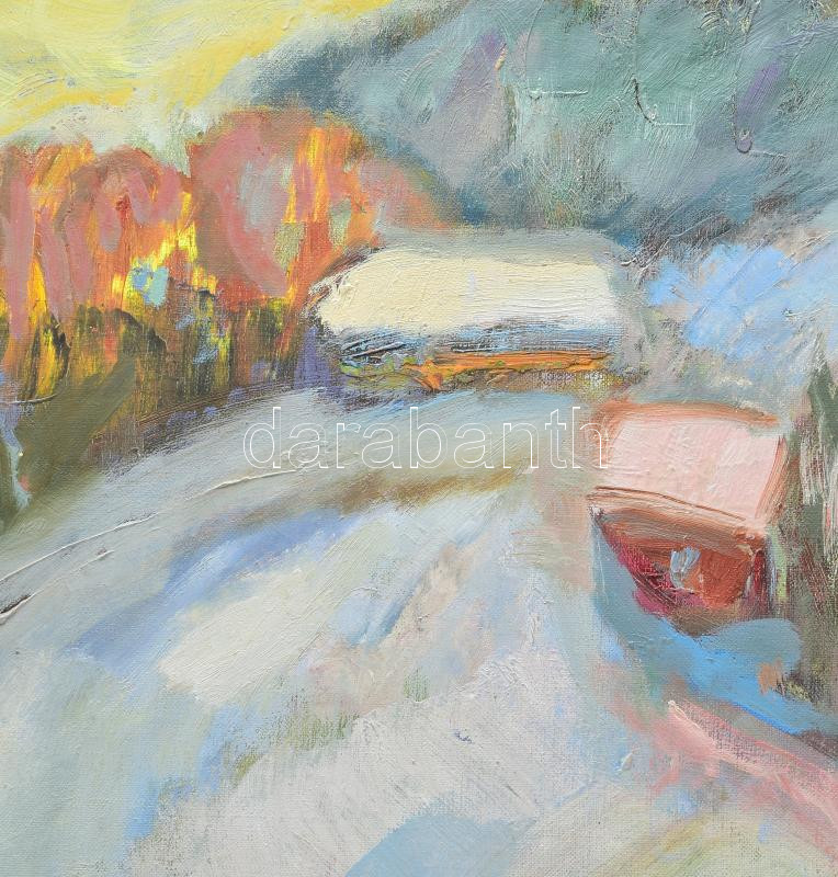 Leírás: Tallós Ilona (1918-1991): Dombos téli táj. Olaj, vászon, faroston, jelzés nélkül. Katalógusszám nélkül. 57×78 cm. Keretben.