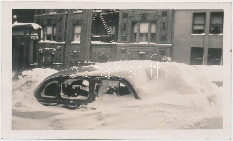Leírás: 1947. december 26. New York, Autó a hó alatt, Amerikába kivándorolt magyarok feliratozott és hazaküldött fotója, 7x12 cm