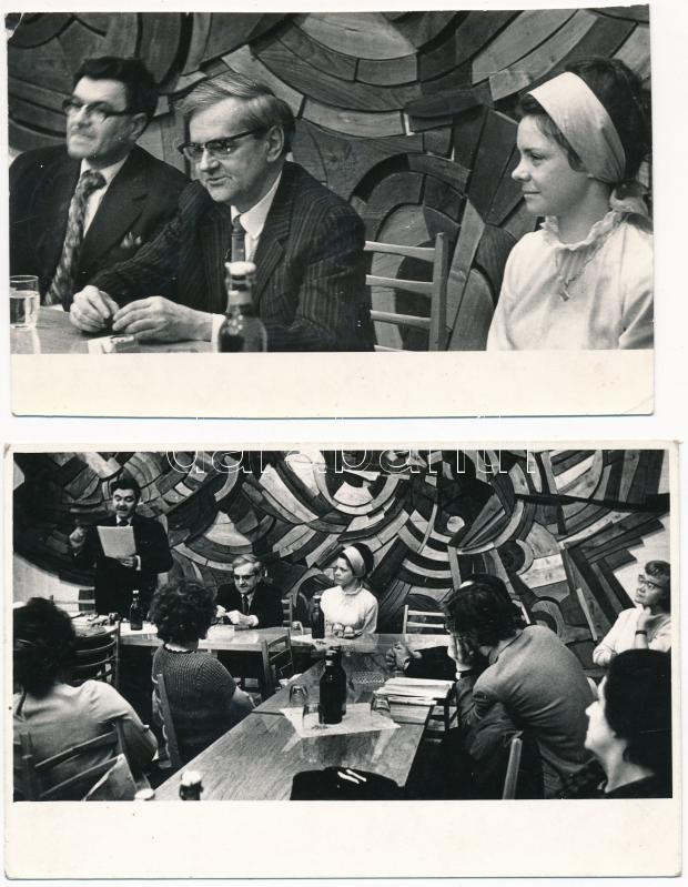 1974. május 6. Weöres Sándor (1913-1989) költő, író találkozása olvasóival, Tiszavölgyi József felvételei, pecséttel jelzett, feliratozott 2 db fotó, egyiken Rákóczi emlékbélyegzés, 9x13 cm