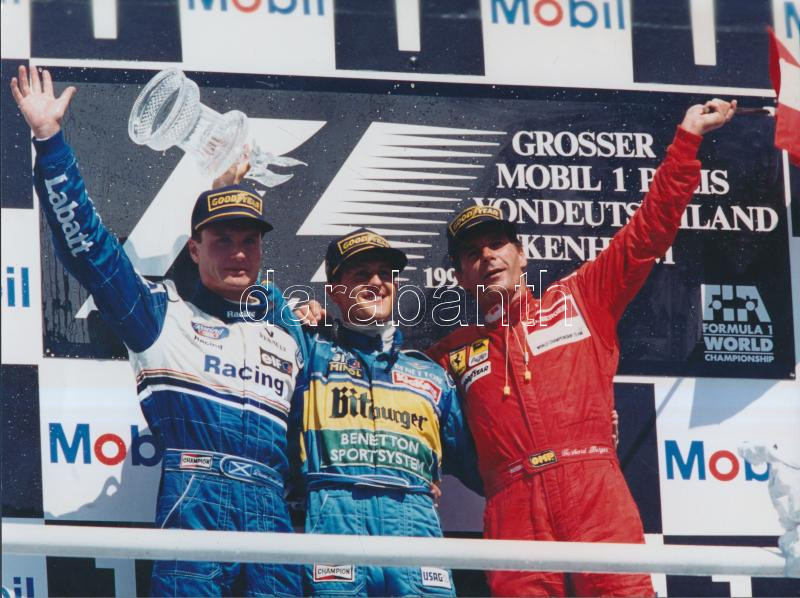 1995 Hockenheim, Németország, A dobogósok: Michael Schumacher, David Coulthard, Gerhard Berger, színes fotó, hátoldalon feliratozva, 24x18 cm /