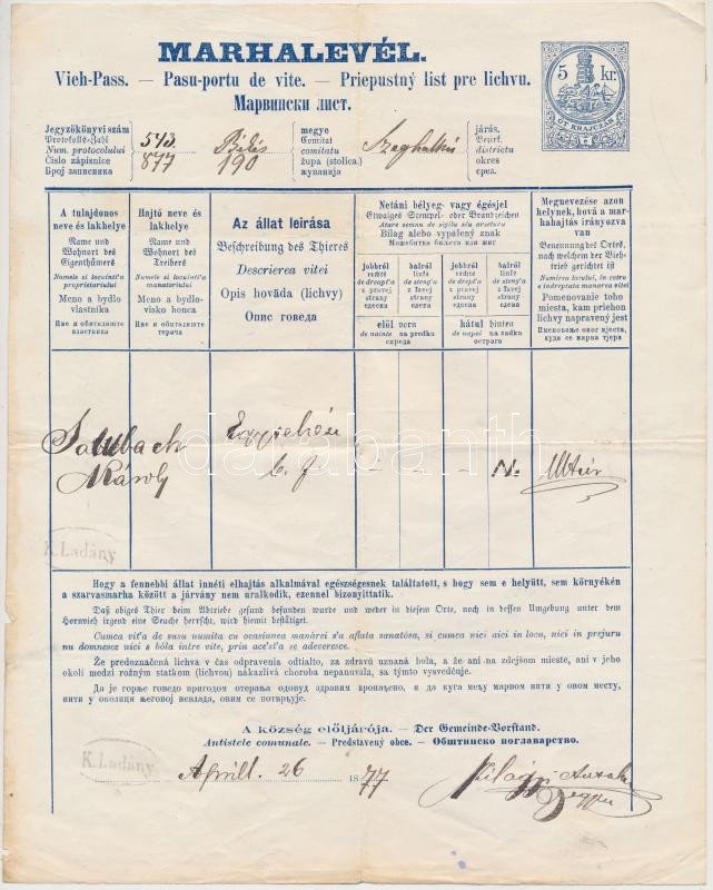 Leírás: 1877 Körösladány, Kétnyelvű marhalevél 5kr okmánybélyeggel K.Ladány oválbélyegzővel