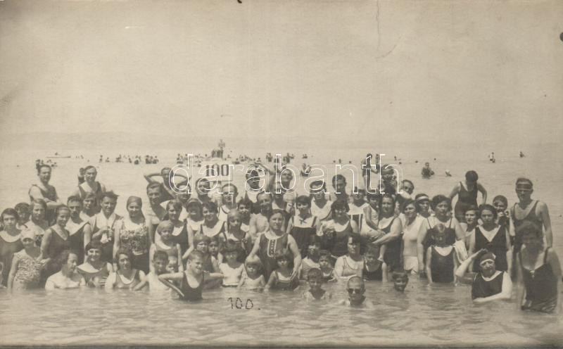 1928 Siófok, fürdőzők 100-as táblával, Nagy István fotó-szalon, photo https://www.darabanth.com/hu/233-Gyorsarveres/233.0/Kepeslapok/Magyarorszag~5/1928-Siofok-furdozok-100-as-tablaval-Nagy-Istvan-foto-szalon-photo~II1058474