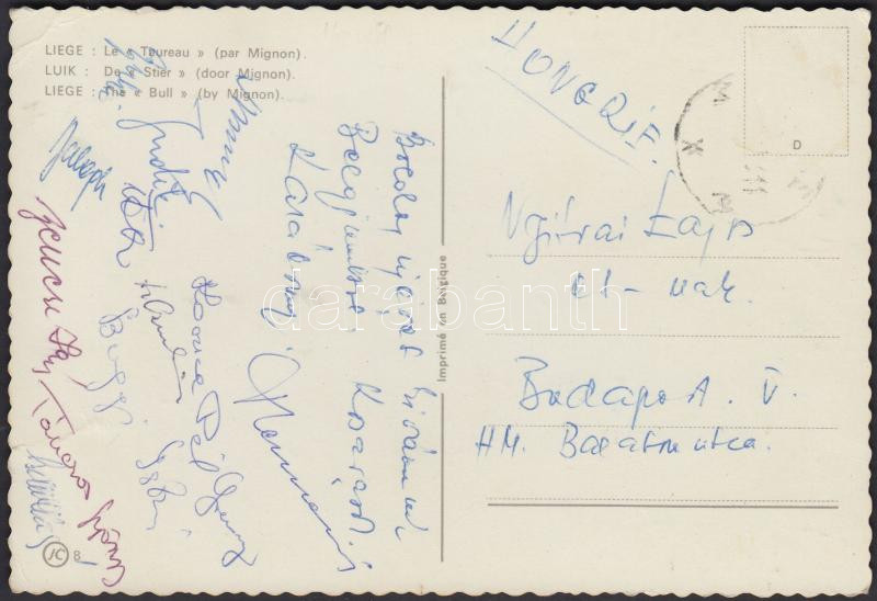 Leírás: cca 1960 a Bp. Honvéd kosárlabdacsapata tagjainak üdvözlő sorai és aláírásai a Standard Liège elleni meccs után Liège-ből elküldött levelezőlapon