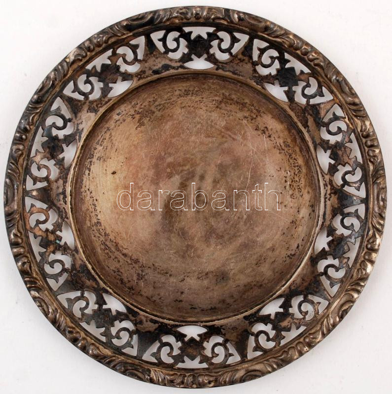 Leírás: Ezüstözött díszes fém tálka, d: 15,5 cm