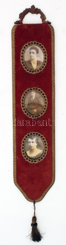 Leírás: Falra akasztható díszes régi fényképtartó, benne három családi fényképpel, h: 48,5 cm