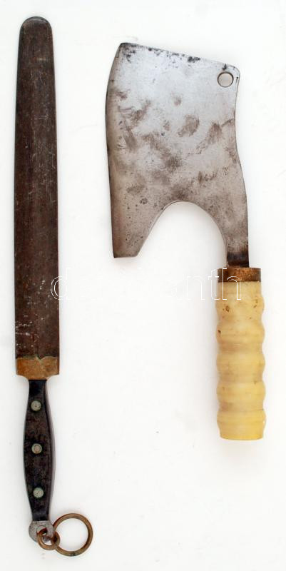Húsvágó bárd, h: 30,5 cm + fenőkés, h: 41 cm https://www.darabanth.com/hu/234-Gyorsarveres/234.0/Festmeny-mutargy-papirregiseg-egyeb/Bolhapiac~40024/Husvago-bard-h-30-5-cm-plus-fenokes-h-41-cm~II1067071