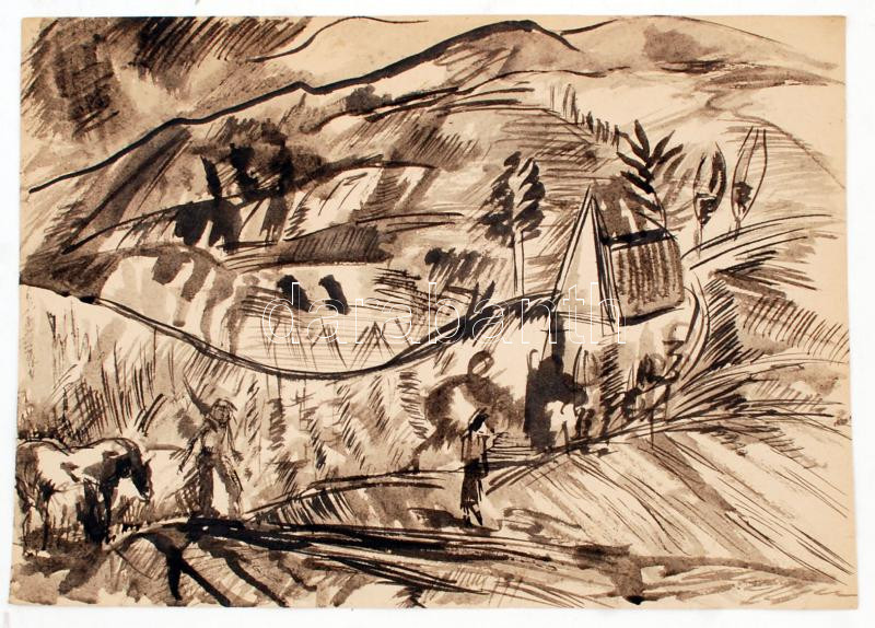 Jelzés nélkül: Tájkép alakokkal. Tus, papír, 29×41 cm https://www.darabanth.com/hu/234-Gyorsarveres/234.0/Festmeny-mutargy-papirregiseg-egyeb/Festmenyek-es-grafikak~40121/Jelzes-nelkul-Tajkep-alakokkal-Tus-papir-29C39741-cm~II1070830